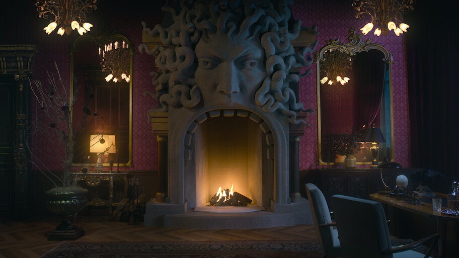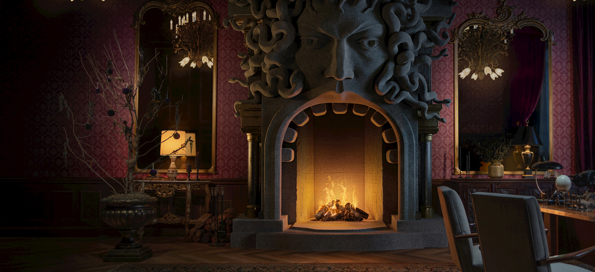 Woe to all seeking cheer — for at Nevermore, Yuletide flames cast shadows, the decor whispers doom and a hand tends the hearth.