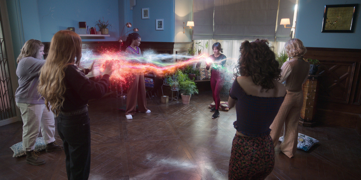 Bloom (Cowen), Terra (Eliot Salt), Aisha (Precious Mustapha), Musa (Elisha Applebaum), Stella (Hannah van der Westhuysen) and Flora (Paulina Chávez) test their powers together.