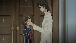 Seeing the state Yuki is in, Kaname takes her from Zero, who is speechless when he realizes what he has done. Yuki cries, unaware of Zero’s secret.